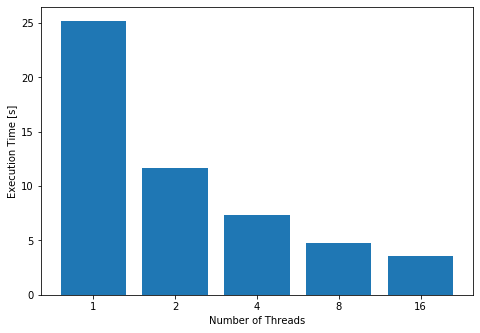Let us run that method over a list of 16 addresses and check their execution times for some different thread counts. That would get us the following graph (executing on a MacBook Air 2019).