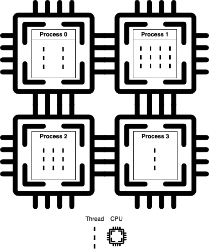 multithreading implements concurrency, multiprocessing implements parallelism. Processes run on separate processing nodes.