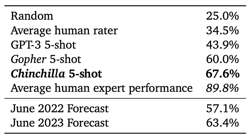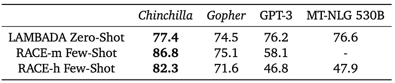 Reading comprehension and automated reasoning are standard tasks a language model is typically tested on. It tests the model’s ability to understand the broader context of the text. In our case, it could be exemplified as predicting words that could only be expected if the model could understand the relation between this word and the context that came before it (sometimes far from this word’s position). It is usually evaluated using benchmarks and datasets such as RACE-h, RACE-m [4], and LAMBADA [5]. Chinchilla outperforms much bigger models even on this type of hard-to-define and test tasks.