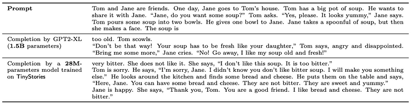 Further reinforcing the thesis that LMs don’t need to be gigantic to perform well, TinyStories [8] presents a synthetic dataset of stories containing only words that small children (up to four years old) can understand. It can be used to train small language models (SLMs) with under 10 million parameters that can generate multi-paragraph stories with good grammar, reasoning, and coherence. This contrasts previous works where 125M+ parameter models — such as GPT-Neo (small) and GPT-2 (small) — struggled to produce a coherent text.